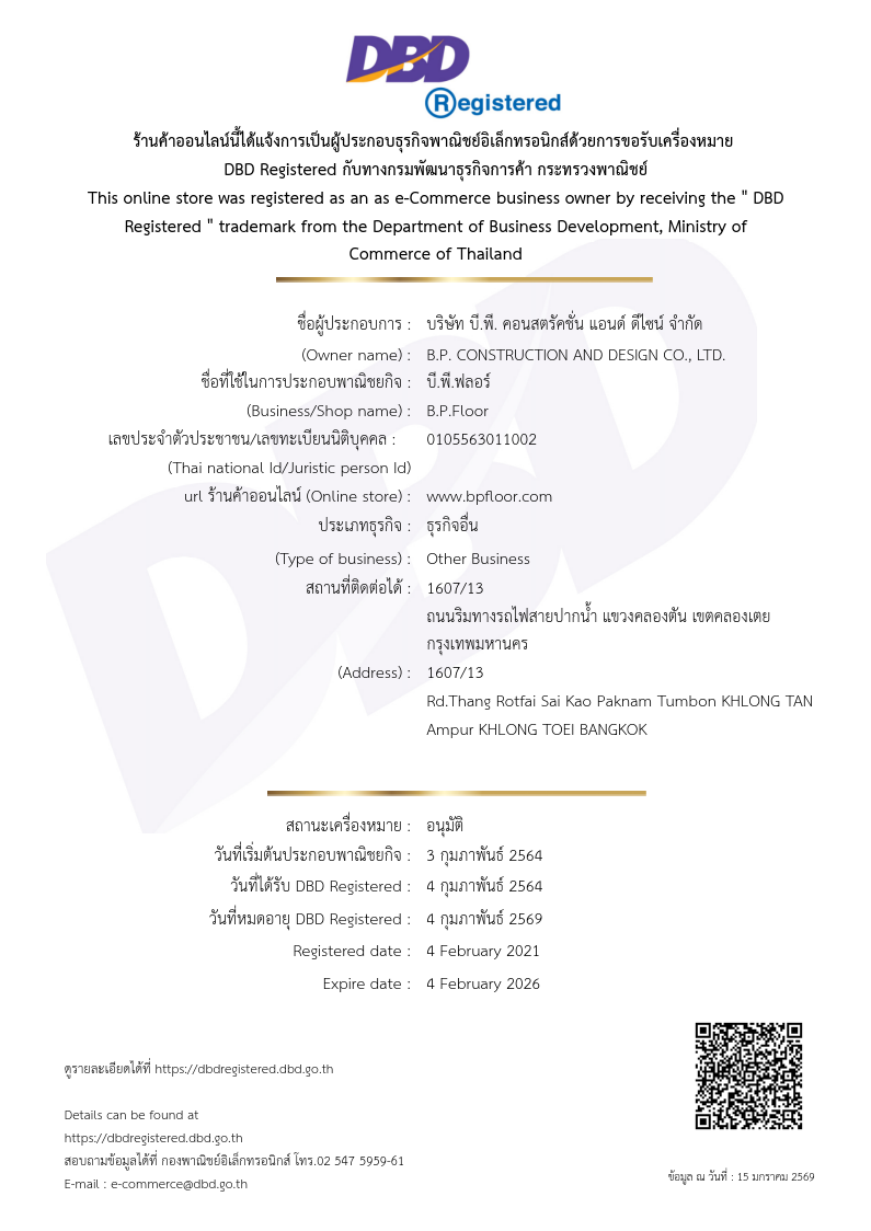 ผู้นำเข้า จำหน่าย และ ติดตั้ง กระเบื้องยางลายไม้ SPC พรมแผ่น พรมม้วน B.P. Floor เป็นที่รู้จักในแบรนผู้รับปูพื้นครบวงจรมามากกว่า 10 ปี ที่จะตอบสนองทุกโจทย์ ความต้องการของลูกค้า ด้วยความจริงใจ คุ้มค่า พร้อมทั้งทีมงานคุณภาพที่มีทักษะ ศักยภาพ และความพร้อมที่จะทำให้งานที่ได้รับเสร็จ สมบูรณ์ เรียบร้อยที่สุด เพราะความพึงพอใจของคุณ คืองานหลักของเรา